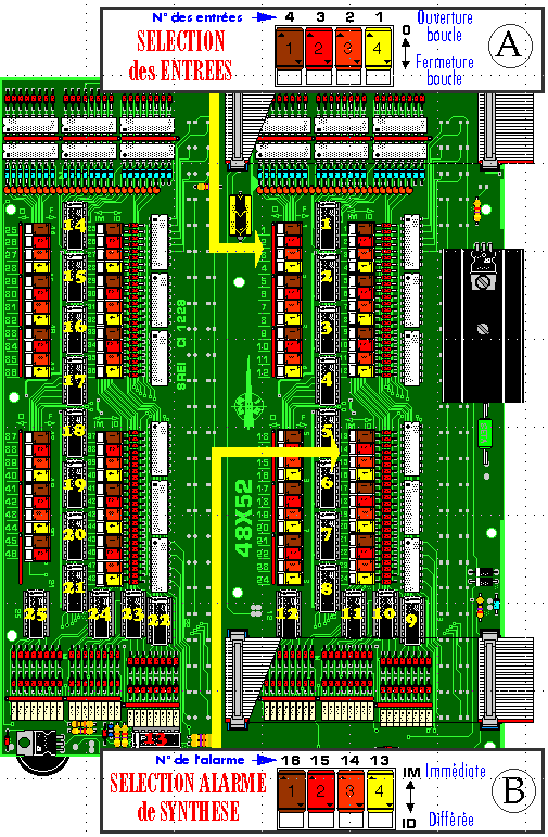 Dans la partie fixe du boîtier se trouve le circuit imprimé supportant les bornes, les relais de sorties et le fusible (0,25 A). Dans le couvercle de l'appareil se trouve le circuit imprimé haute densité, trous métallisés. Ce circuit est équipé de programmations individuelles des entrées en ouverture ou fermeture de boucle, par inter à glissière (A), ainsi que des programmations individuelles des alarmes de synthèses IM et ID par inter à glissière (B). Les alarmes de synthèse permettent de disposer d'un niveau de transmission urgent ou différé pour chacune des entrées.